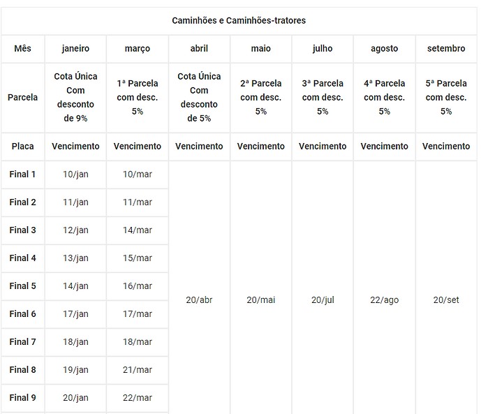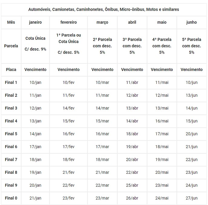 Para aproveitar o benefício, os proprietários devem ficar atentos às datas de vencimento. O calendário de vencimento de acordo com o final de placa dos veículos segue até o dia 21/1, considerando apenas os dias úteis (veja na tabela abaixo).